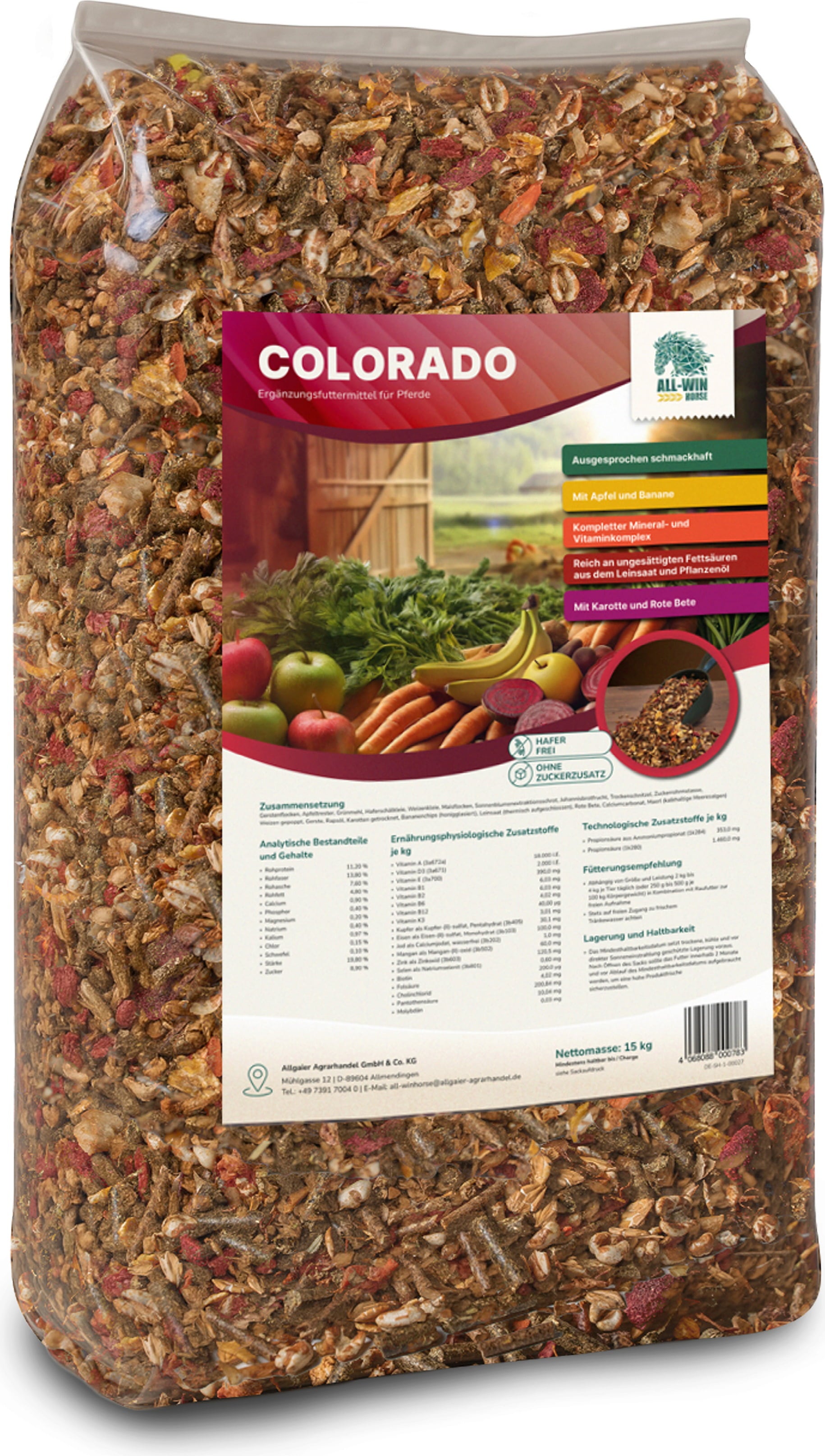 Iščete okusno dopolnilno krmo za svojega konja? ALL-WIN Horse Colorado navduši z uravnoteženim receptom – popolnoma brez ovsa in brez dodanega sladkorja.