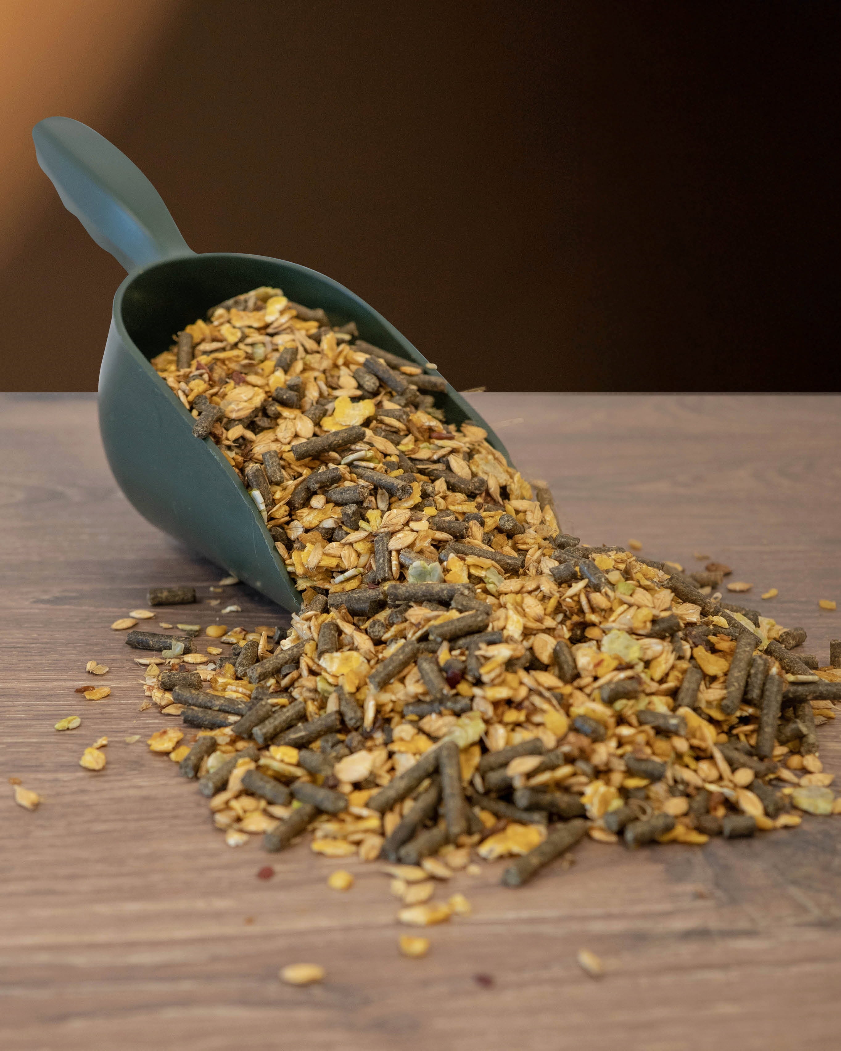 zrobljenec izvlečkov sončnice (s soapstockom), koruzni kosmiči, ječmenovi kosmiči, pšenični kalčki, zelena moka, Rapsextraktionsschrotfutter mit Stock aufgeschlossen, jabolčne tropine, kalcijev karbonat, grahovi kosmiči, melasa iz sladkornega trsa, popečeni kosmiči zrn soje, repično olje