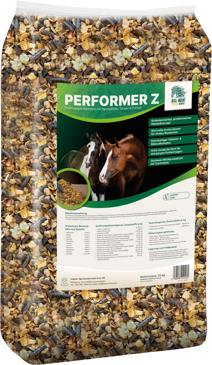 Performer Z je müsli brez ovsa, ki je posebej prilagojen potrebam športnih konj, plemenskih kobil in žrebet. Premišljena receptura zagotavlja visokokakovostne beljakovine in esencialne aminokisline ter uravnotežen kompleks vitaminov in mineralov. Zaradi izbranih, lahko prebavljivih sestavin je musli lahko prebavljiv tudi za občutljiv želodec žrebet. Performer Z podpira koncepte krmljenja, optimizirane za obroke v športnih in vzrejnih hlevih - brez ovsa, vendar z uravnoteženim profilom hranil.