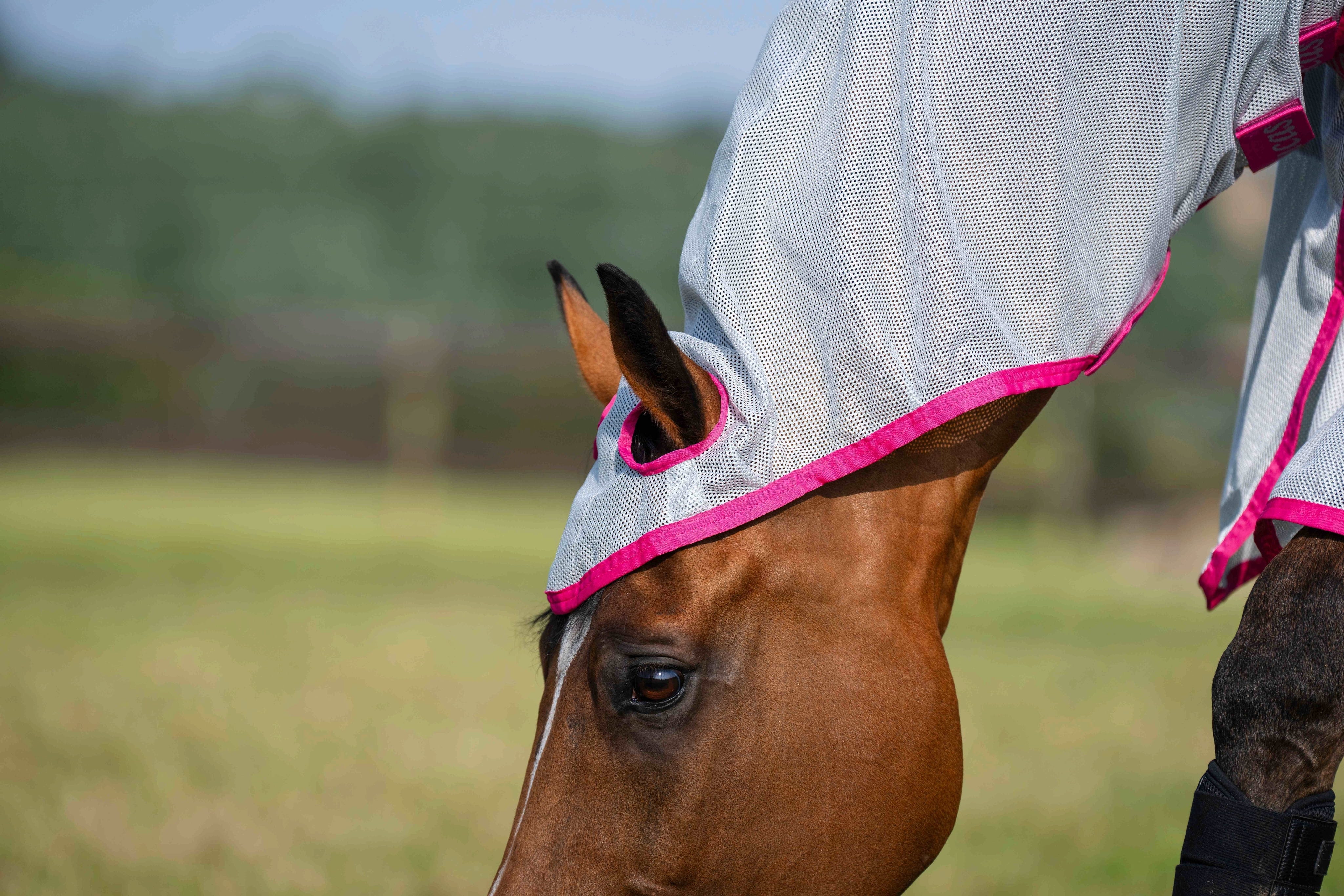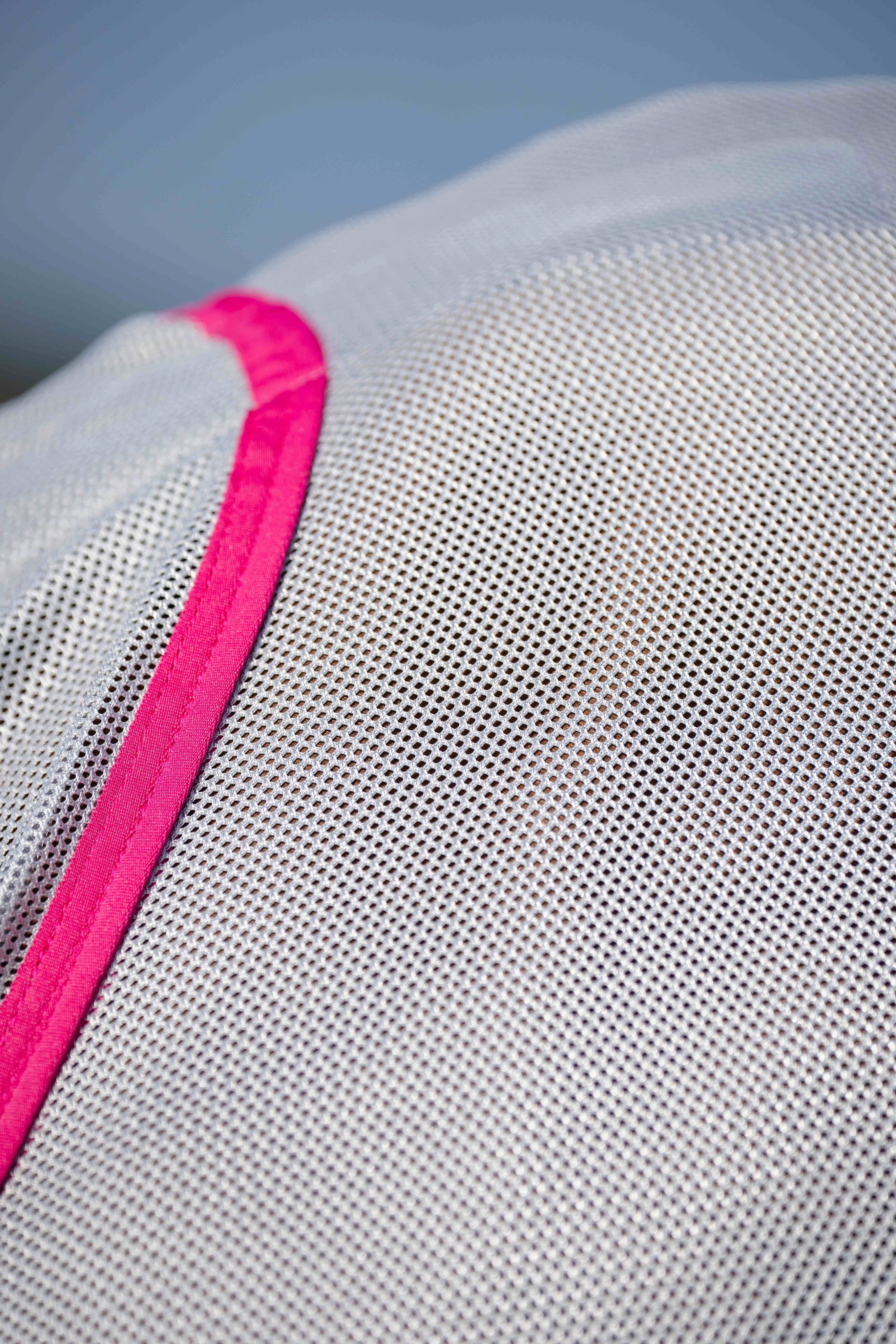 Inovativna in lahka mrežica v svetlem videzu deluje kot visoko funkcionalen ščit, ki ne le odganja žuželke, temveč s svojo odbojno površino preprečuje tudi bledenje dlake zaradi intenzivnega sončnega sevanja. Zahvaljujoč posebni strukturi materiala vaš konj pod pregrinjalom uživa v optimiziranem kroženju zraka, kar zagotavlja prijetno telesno klimo tudi v vročih dneh brez vetra.