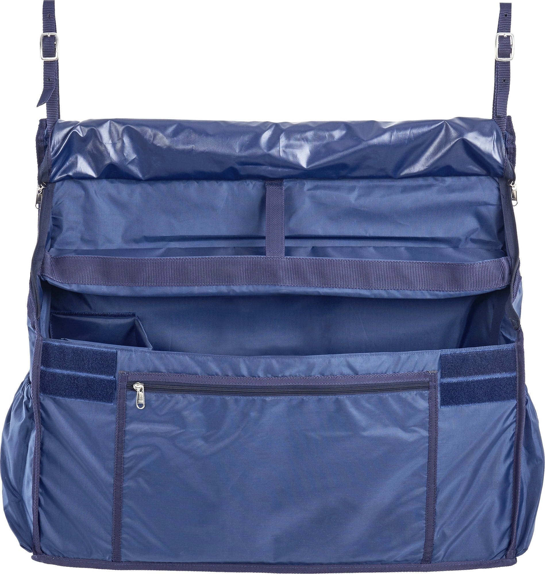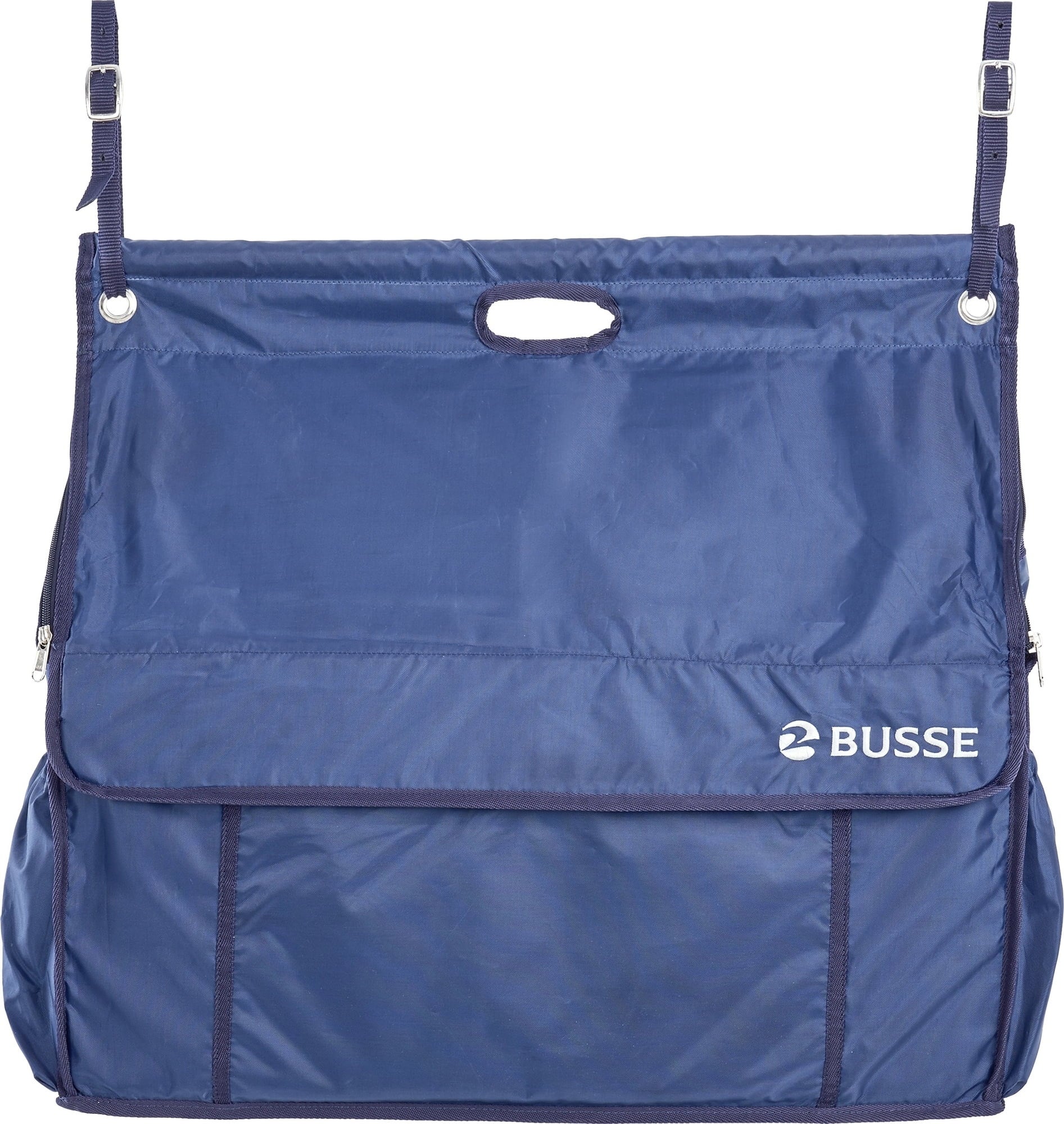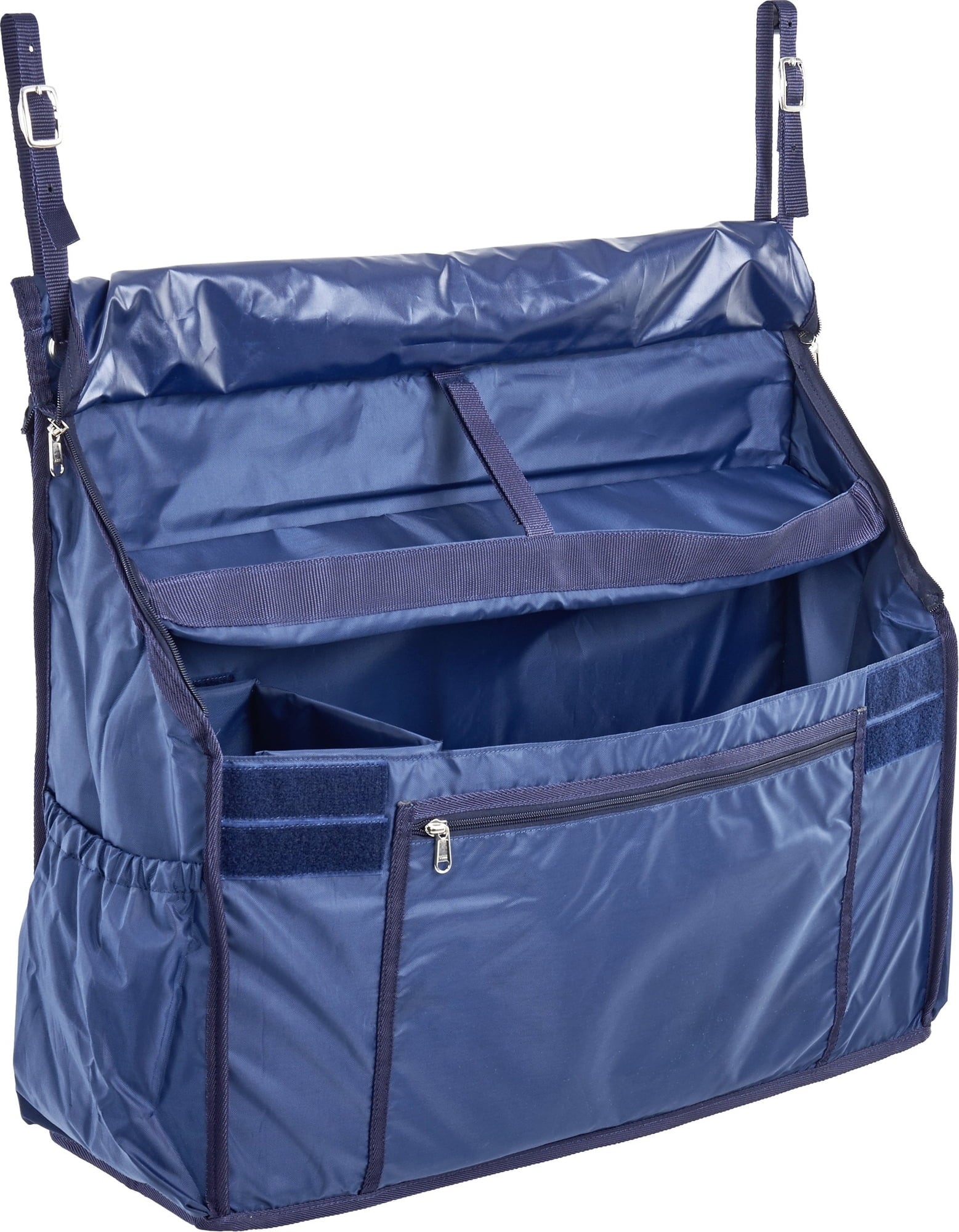 Prostorna viseča torba za pritrditev na steno boksa. Najpomembnejši hlevske pripomočke in pripomočke za jahanje imejte vedno pri roki. Torba ponuja dovolj prostora in ojačane, individualno nastavljive delilnike za shranjevanje stvari, kot so konjske odeje, povoji, ščitniki, zvonci za kopita, predmeti za nego in oglavke. Zunanji predali za shranjevanje nudijo dodaten prostor za predmete, ki so tako lahko vedno na dosegu roke.