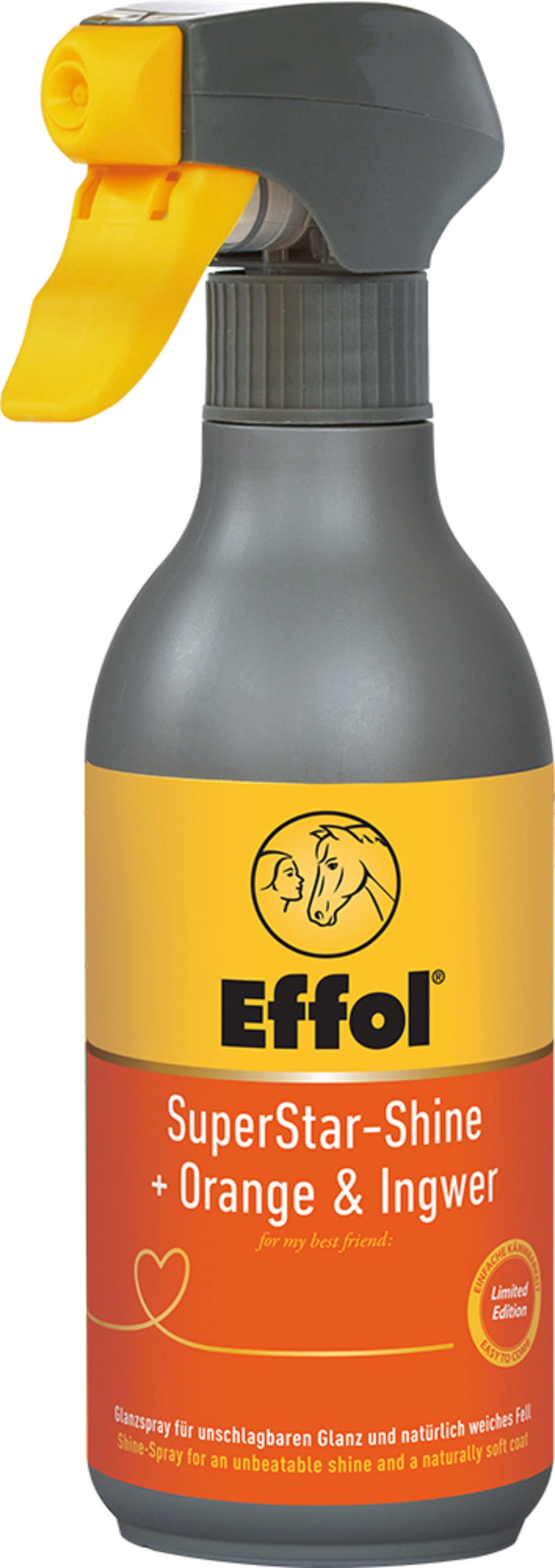 Sprej za sijaj Effol SuperStar-Shine Orange & Ginger daje dlaki, grivi in repu intenziven, naraven sijaj brez umetnega občutka ali ostankov. Posebna formula s silikonskimi emulzijami olajša vsakodnevno nego: vozli, ostružki in slama se pri česanju odstranijo skoraj brez napora, dolga dlaka pa pridobi volumen in prožnost. Hkrati pomaga preprečevati krhkost in suhost dlake. Kombinacija sadnega vonja pomaranče in pikantnega ingverja naredi nanos prijetno izkušnjo v vsakodnevni rutini hleva.