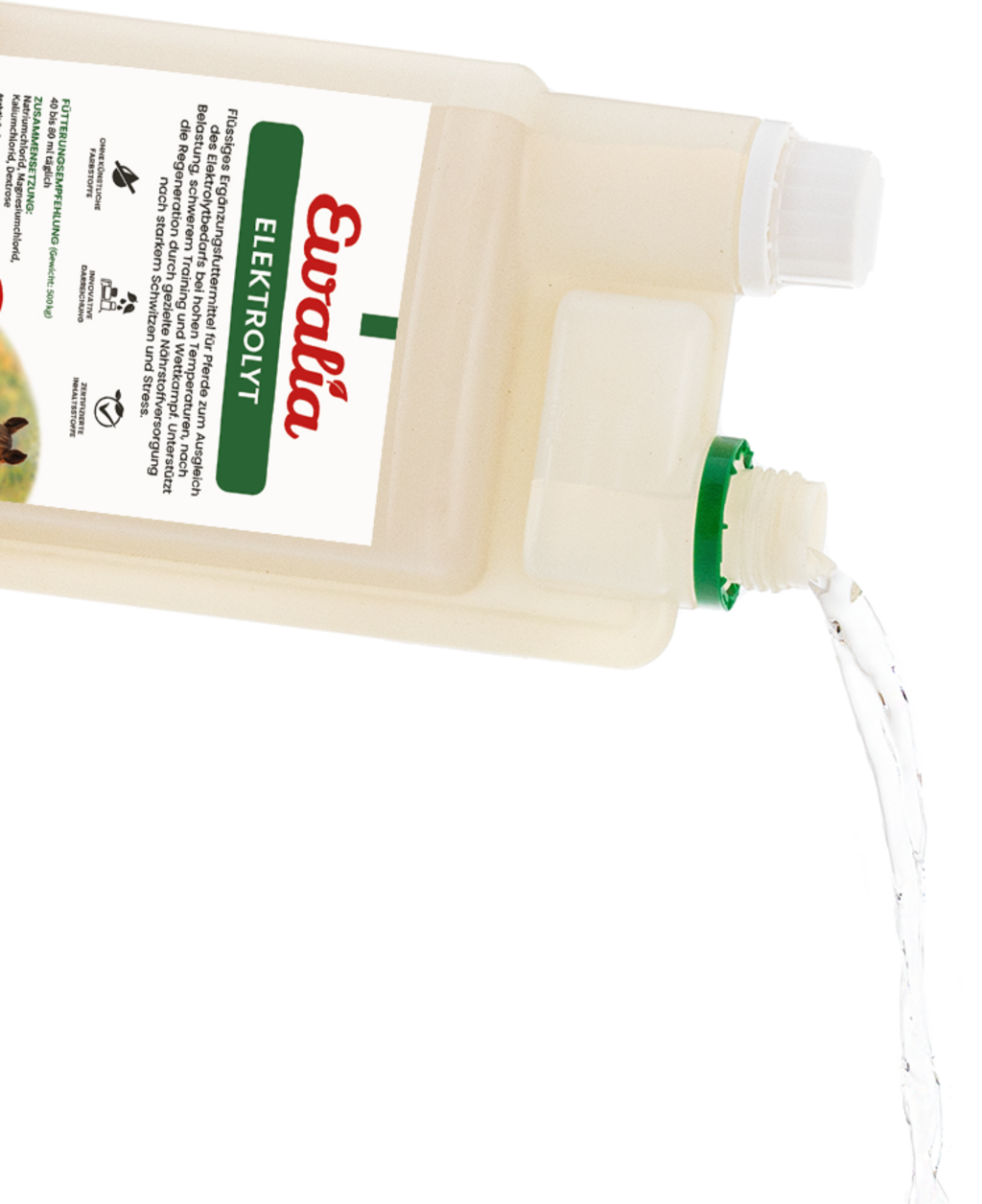 Tekoči dodatki za krmo za konje, kot nadomestilo za elektrolite se priporočajo pri visokih temperaturah, težkih treningih in tekmovanjih. Podpira regeneracijo skozi ciljno oskrbo s hranili po obilnem znojenju ali stresu.