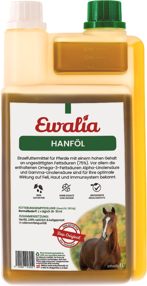 Olje konoplje Ewalia ponuja široko paleto uporabe. Hladno stiskano olje ne vsebuje občutljivih količin THC, zato ni nobenih neželenih učinkov. Je 100% čisto, nima aditivov in je bogato s polinenasičenimi maščobnimi kislinami (75%). Ugodne omega-3 maščobne kisline imajo še posebej pozitiven učinek na kožuh, kožo in imunski sistem. Poleg tega ima konopljino olje najpomembnejše aminokisline, vitamine, antioksidante, minerale, encime in fitokemikalije.