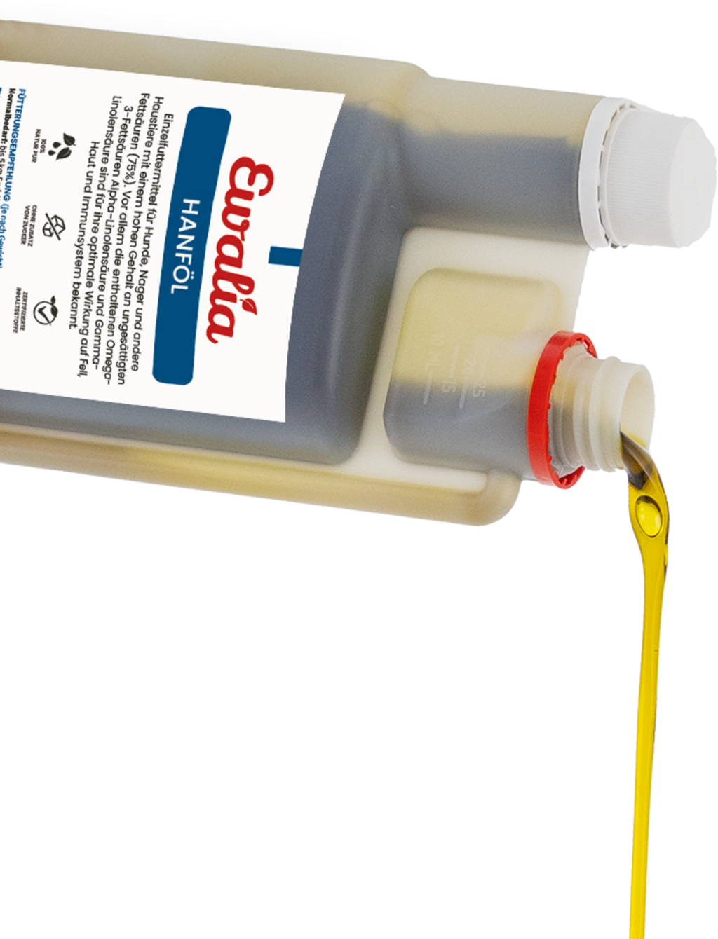 Olje konoplje Ewalia ponuja široko paleto uporabe. Hladno stiskano olje ne vsebuje občutljivih količin THC, zato ni nobenih neželenih učinkov. Je 100% čisto, nima aditivov in je bogato s polinenasičenimi maščobnimi kislinami (75%). Ugodne omega-3 maščobne kisline imajo še posebej pozitiven učinek na kožuh, kožo in imunski sistem. Poleg tega ima konopljino olje najpomembnejše aminokisline, vitamine, antioksidante, minerale, encime in fitokemikalije.