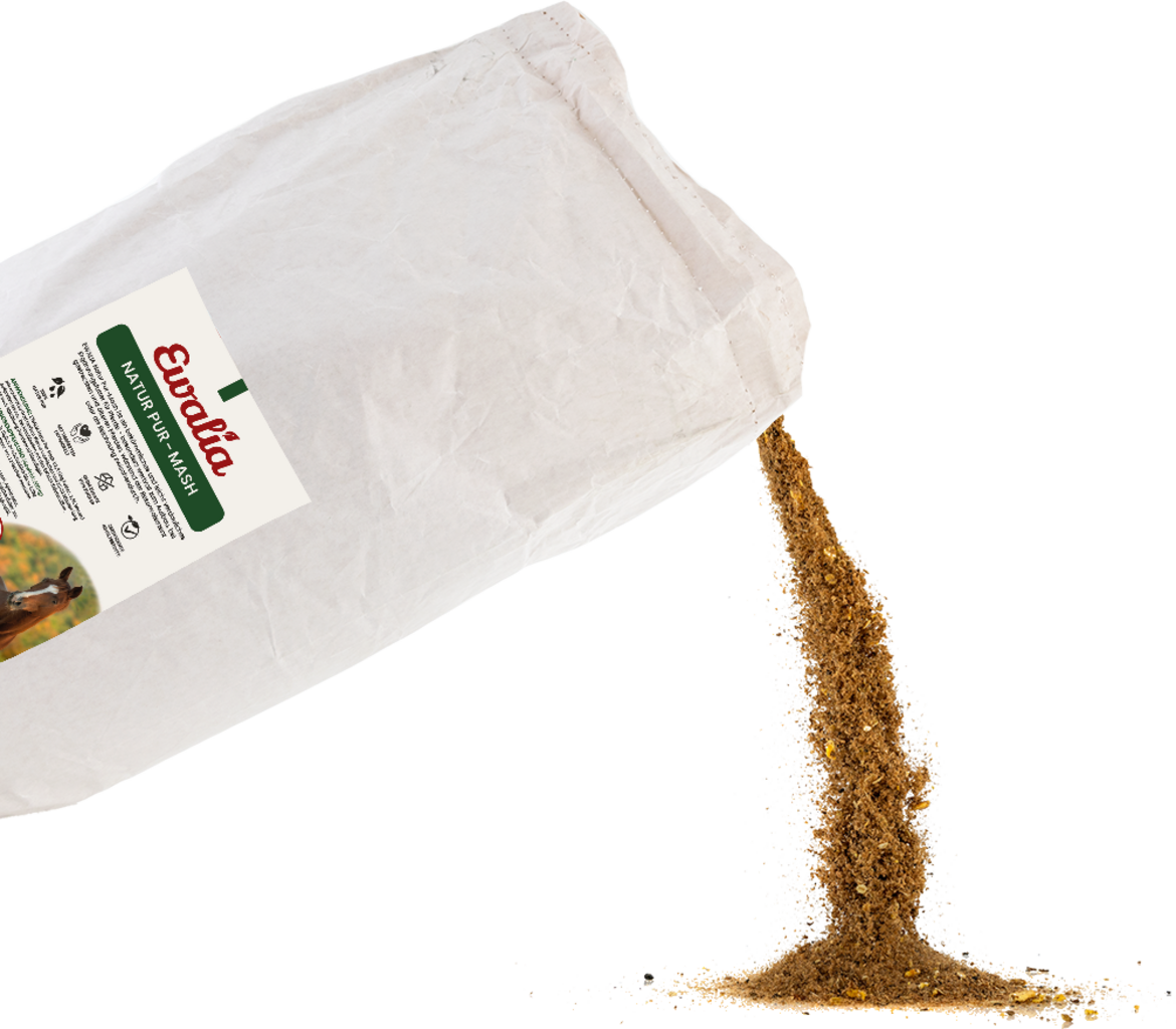 Izdelek zmešajte v razmerju 1:1,5 (1 kg krme: 1,5 litra vode) z največ 50 stopinjami vroče vode in pustite počivati 15-20 minut. Po želji lahko dodate zeliščne sokove Ewalie, potem ko pustite, da se drozga ohladi (po možnosti, ko je mlačna).