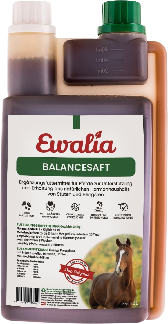 EWALIA sok za harmonijo je dodatek za konje za pomoč pri težavah z jahanjem zaradi hormonskega neravnovesja. Dragocene sestavine navadne konopljike, ki lahko krepi nastajanje hormonov. Damiana se pogosto uporablja tudi za depresijo, pa tudi pri podpori serotonina.