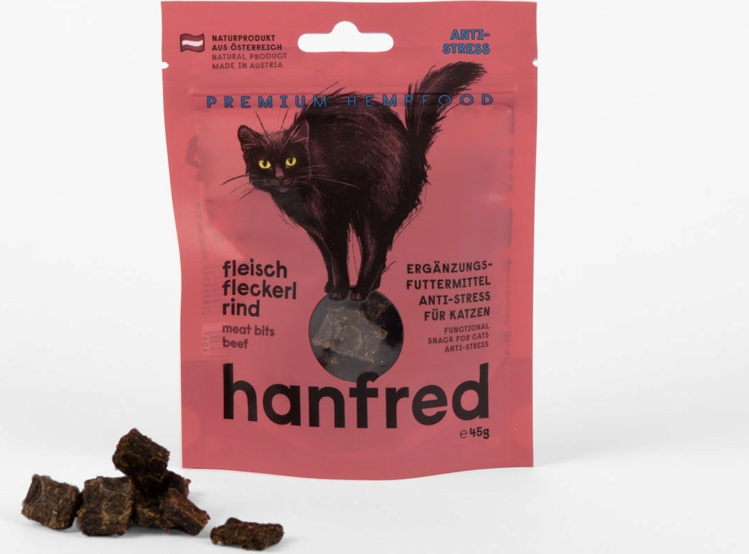 Če je vaša mačka občutljiva na spremembe ali stresne situacije, je ta prigrizek lahko dobra izbira. Hanfred mesne pogače so narejene iz 95 % mesa in 5 % konopljinega prahu - popolnoma brez žit in umetnih dodatkov.