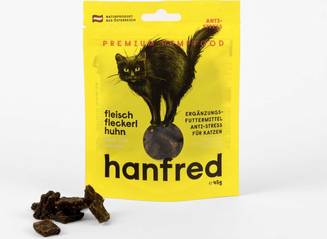 Če je vaša mačka občutljiva na spremembe ali stresne situacije, je ta prigrizek lahko dobra izbira. Hanfred mesne pogače so narejene iz 95 % mesa in 5 % konopljinega prahu - popolnoma brez žit in umetnih dodatkov.
