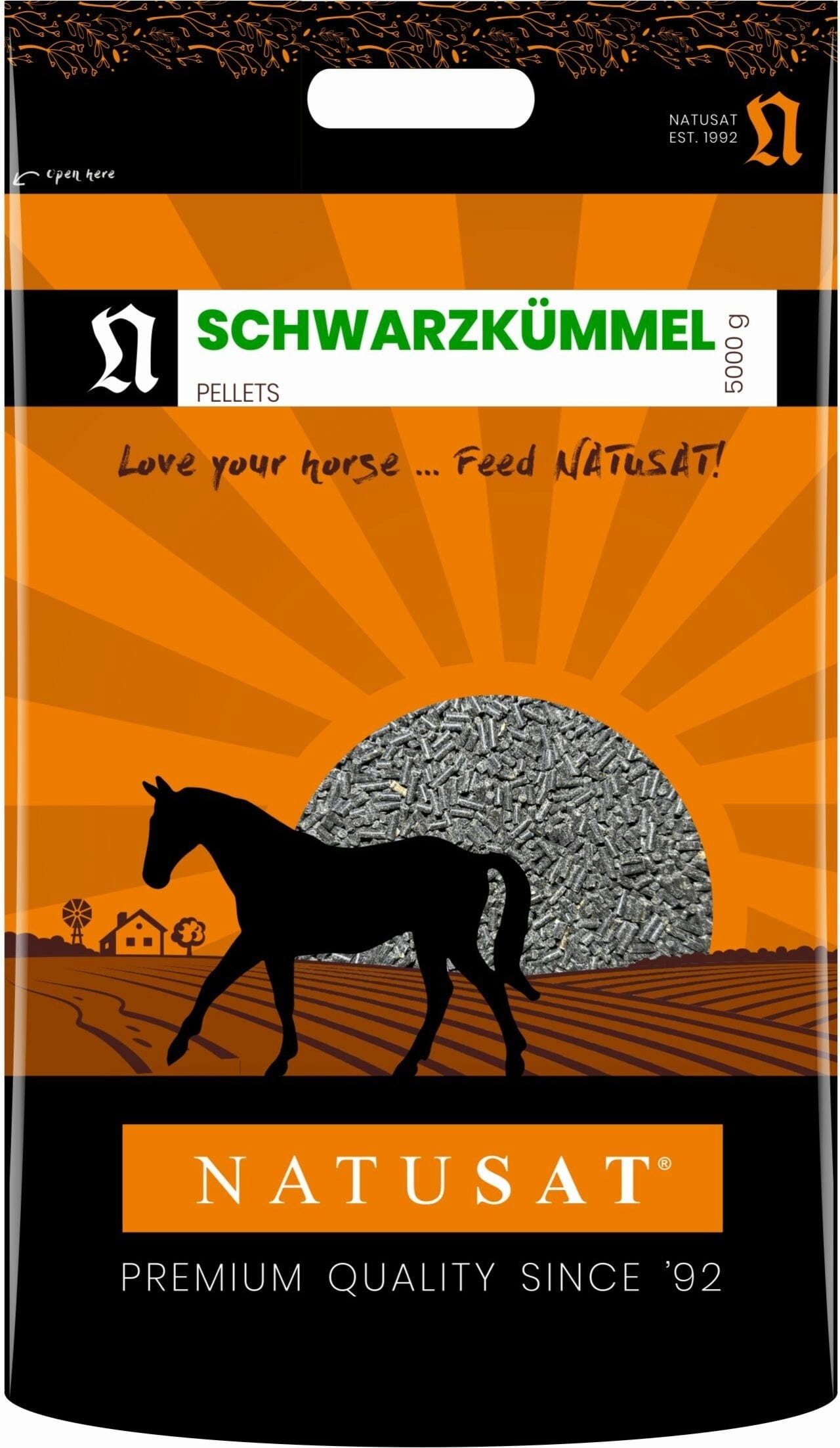 NATUSAT peleti s črno kumino so visokokakovostni dopolnilni krmni peleti za konje, narejeni iz moke črne kumine in izbranih zelišč, kot je poprova meta. Moka črne kumine zagotavlja rastlinske sestavine z visoko vsebnostjo surovih beljakovin, surovih maščob in surovih vlaknin, ki jih konji lahko enostavno vključijo v svoj dnevni obrok. Pelete je mogoče enostavno vmešati v vlaknino ali ponuditi ločeno.