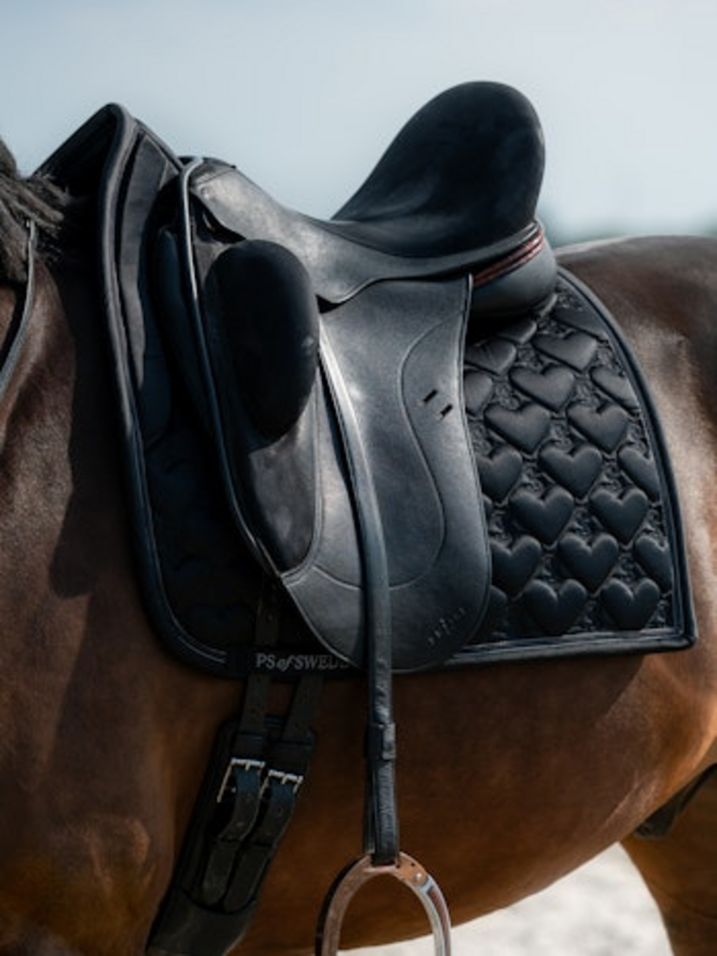 Omejena izdaja podsedelnice Heart v dresurno areno vnese romantiko in eleganco. Presenetljiv vzorec prešitja v obliki srca z vgrajenim logotipom PS jo naredi resnično pašo za oči, dekorativni žameten trak vzdolž roba pa doda prefinjen pridih. Personaliziran citat, izvezen vzdolž hrbtenice, daje še dodaten značaj.