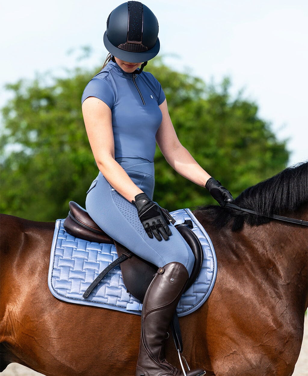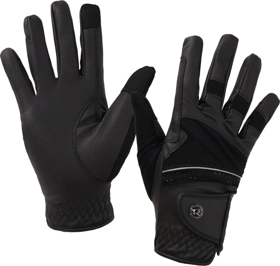 Da se v sedlu ne bi potili, elastična tkanina na hrbtni strani roke zagotavlja stalno prezračevanje. Zapenjanje z ježkom na zapestju zagotavlja varno in nastavljivo prileganje ter preprečuje drsenje ali drgnjenje. Vizualno rokavice naredijo drzen vtis: bleščeče aplikacije na zapenjanju dodajo ravno pravšnji pridih elegance, ki dopolni vašo obleko, ne da bi bil preveč vpadljiv. Funkcionalen dodatek, ki brez napora združuje stil in zmogljivost.