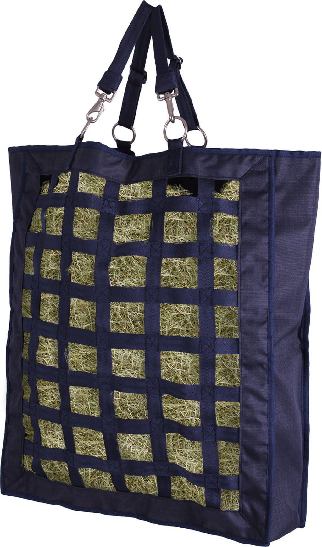 Na vrhu so štirje trdni obročki z dvema nastavljivima sponkama, ki omogočajo fleksibilno in varno obešanje vreče s senom. Za zapiranje vreče preprosto napeljite zanke skozi obročke – hitro in enostavno. Všit obroč zagotavlja, da vreča med polnjenjem ostane odprta, kar omogoča enostavno polnjenje s senom.