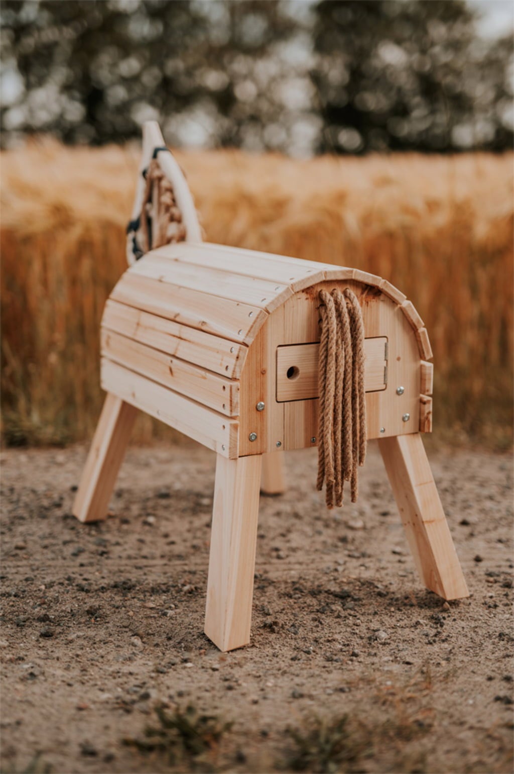 Ta kompaktni leseni konjiček bo navdušil mlade jahače s svojimi ljubečimi detajli in praktičnimi lastnostmi. Ne glede na to, ali je na vrtu ali v otroški sobi, neobdelan les vabi k ustvarjalnemu oblikovanju, integriran prostor za shranjevanje pa ohranja hlev urejen.