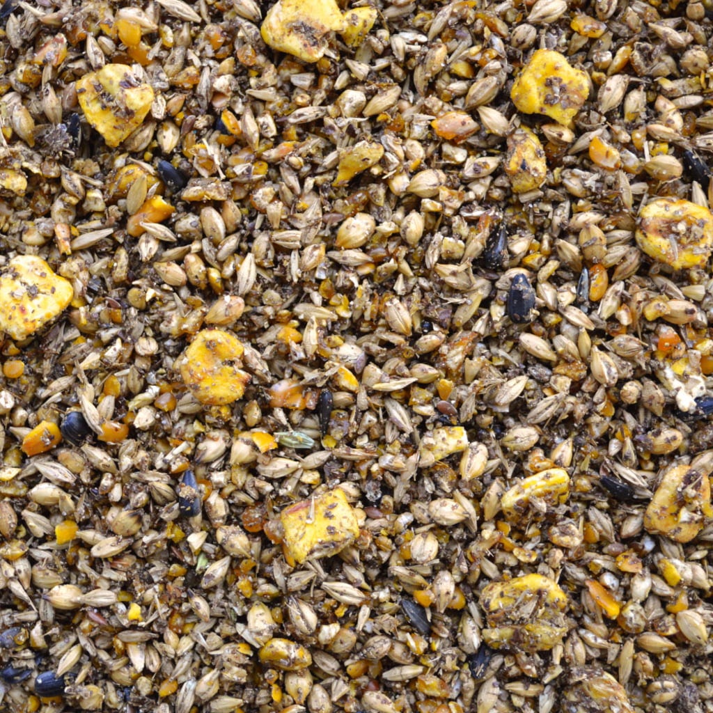 42 % Gerste (gewalzt, gepoppt), 37 % Mais (gewalzt, gepoppt), 7 % Leinkuchenmehl, 5 % fermentiertes Topinambursaftkonzentrat, 2 % sončnična semena, 1,68 % kalcijev karbonat, 1,5 % melasa, 1,5 % lanena semena, 0,6 % pivske tropine, 0,53 % monokalcijev fosfat, 0,47 % natrijev klorid, 0,4 % Bierhefe (inaktiviert), 0,12 % magnezijev oksid