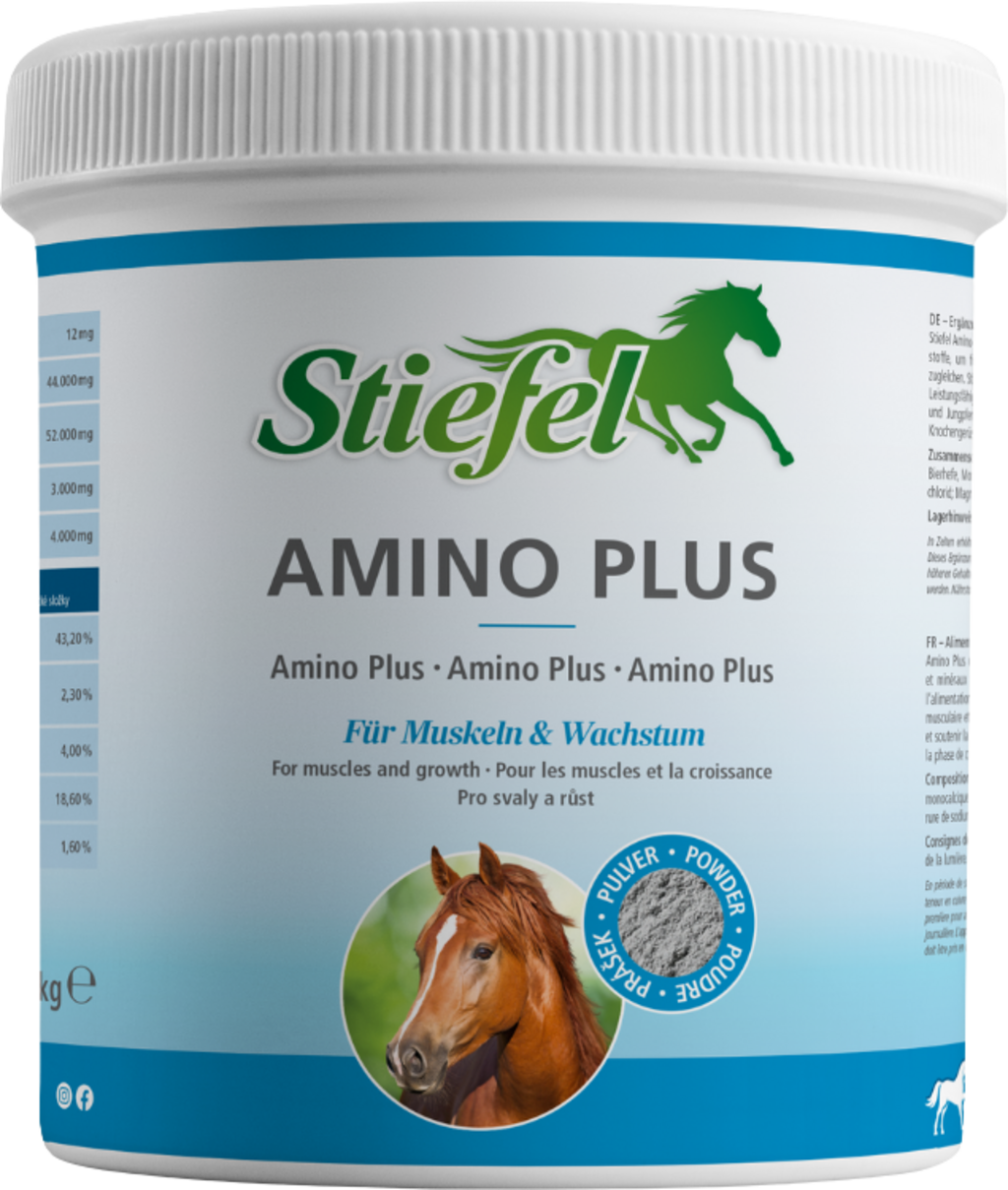 ZDAJ Z NOVO FORMULO. Stiefel Amino Plus vsebuje esencialne aminokisline in minerale za nadomestitev pomanjkanja, povezanega s krmo. Stiefel Amino Plus lahko spodbuja razvoj mišic in zmogljivosti pri športnih konjih ter podpira razvoj kostne in mišične strukture pri žrebetih in mladih konjih v fazi rasti.