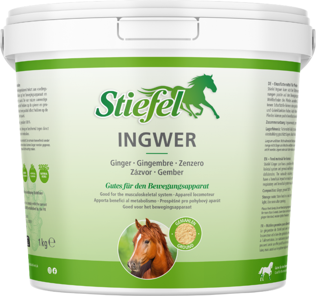 Stiefel ingver lahko pozitivno vpliva na konjev mišično-skeletni sistem in splošno počutje v primeru simptomov prehranske pomanjkljivosti. Naravno prisotne pikatne snovi lahko pozitivno vplivajo na delovanje mišic in sklepov. Pozitivno lahko vpliva tudi na dihalni in bronhialni sistem konja.