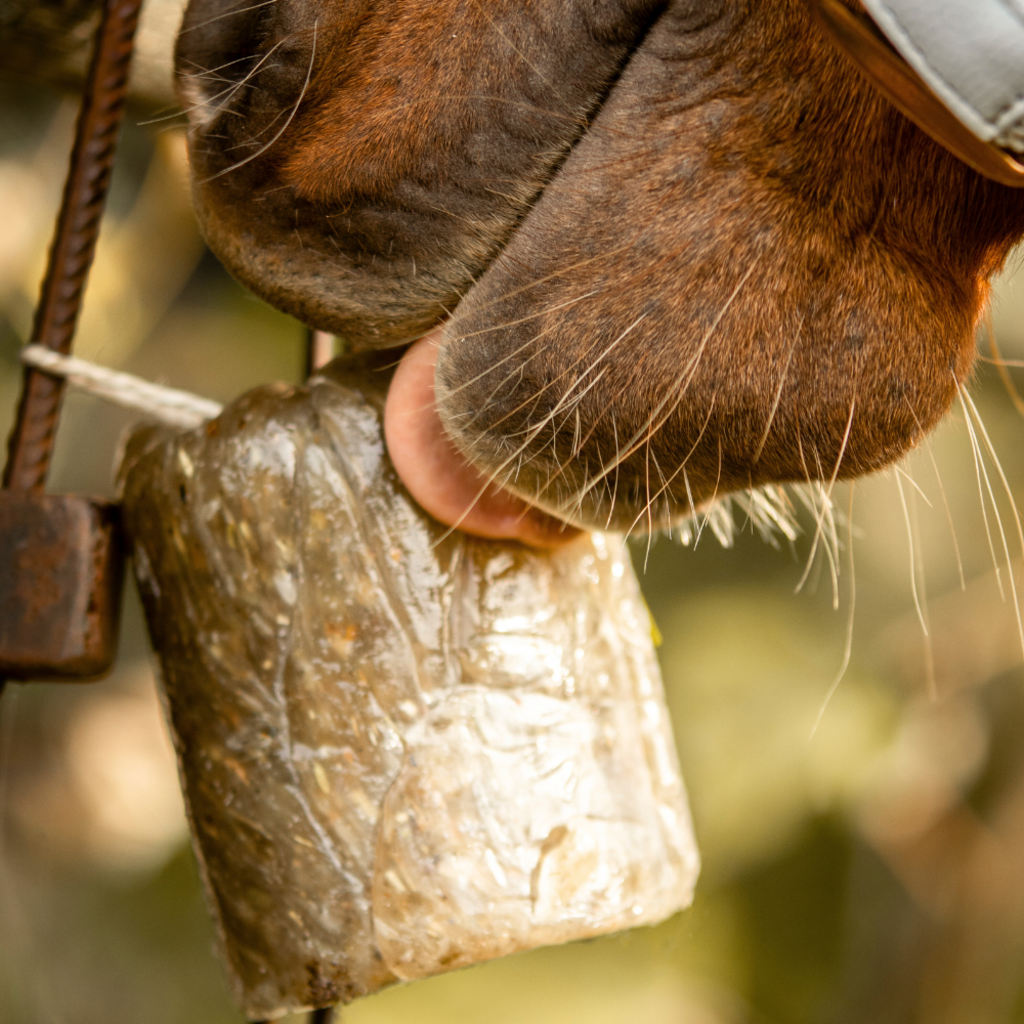 Zeliščni kamen s številnimi dragocenimi naravnimi zelišči. Ta kamen za lizanje se s priloženo vrvico preprosto pritrdi na boks za konje ali ograjo in služi kot okusna aktivnost za konja.