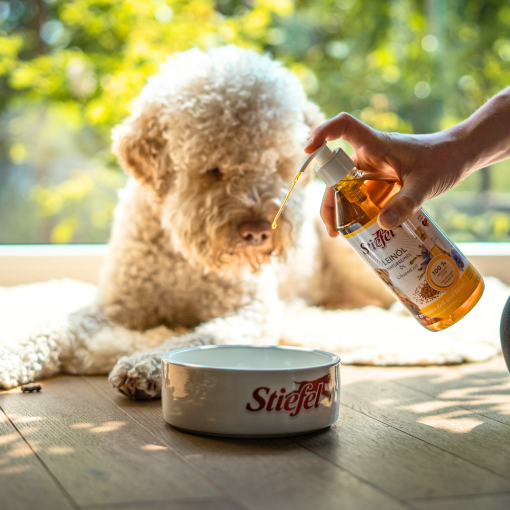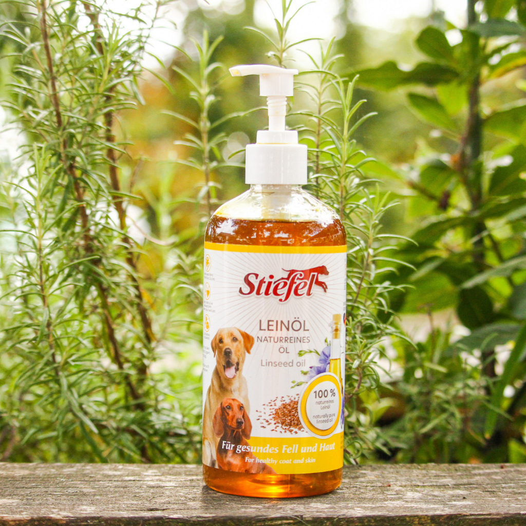Laneno olje Stiefel je hladno stiskan naravni izdelek. Njegova dragocena sestava lahko podpira pasjo dlako in kožo. Laneno olje lahko prelijete tudi po hrani za boljšo prebavo.