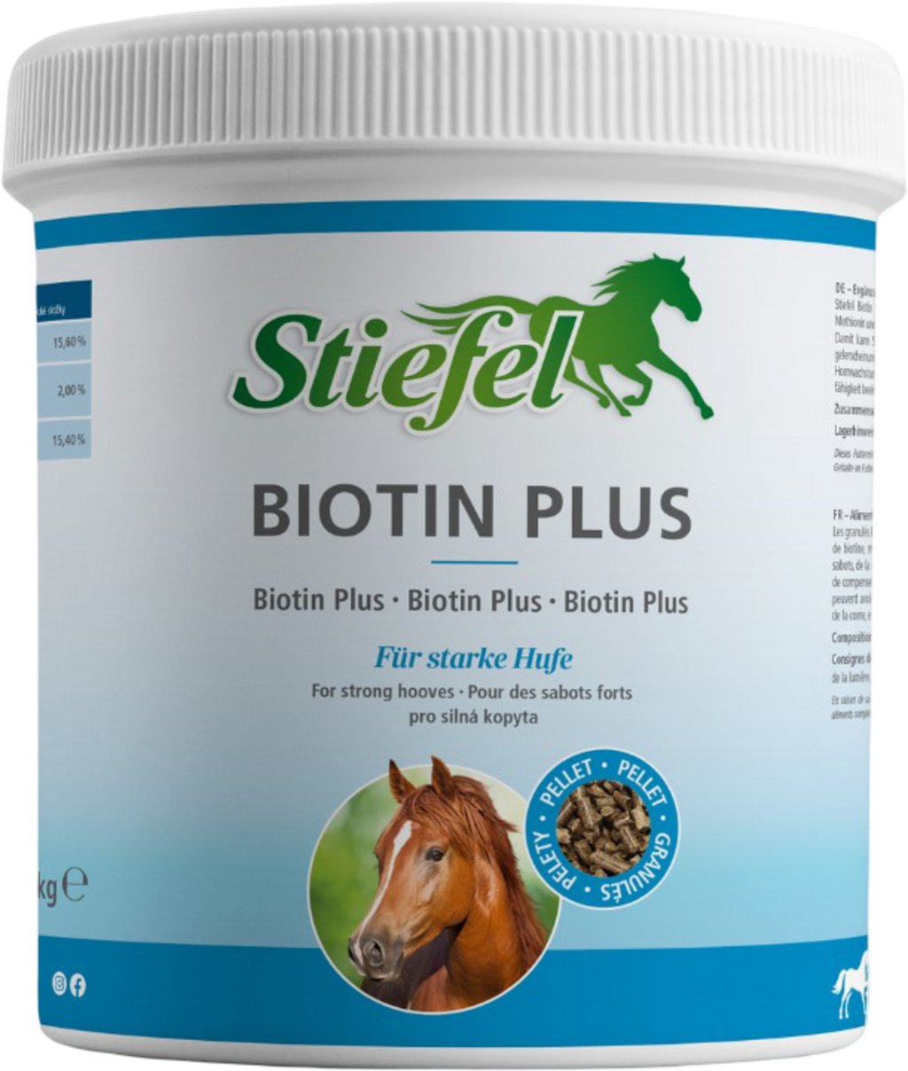 ZDAJ Z NOVO FORMULO. Stiefel Biotin Plus peleti vsebujejo trojno formulo biotina, metionina in cinka za optimalno kakovost kopit, rogov in dlake. Stiefel Biotin Plus lahko tako nadomesti s krmo povezane pomanjkljivosti biotina, ki negativno vplivajo na rast kopit in rogov ter zmanjšujejo elastičnost in