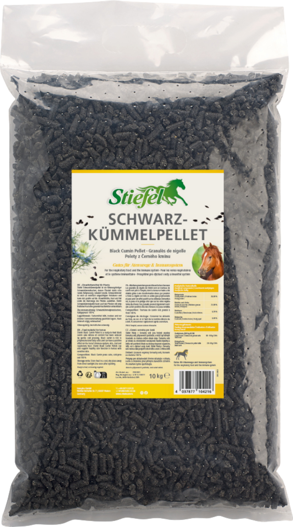 Stiefel peleti iz črne kumine so pripravljeni za krmo, saj je bila vsebnost olja zmanjšana z nežnim hladnim stiskanjem. Črna kumina je bogata s polinenasičenimi maščobnimi kislinami in lahko pozitivno vpliva na konjevo obrambo, kožo, dlako in dihalne poti. Stiefel peleti črne kumine lahko podpirajo tudi zdravo delovanje kože pri konjih z občutljivo kožo.