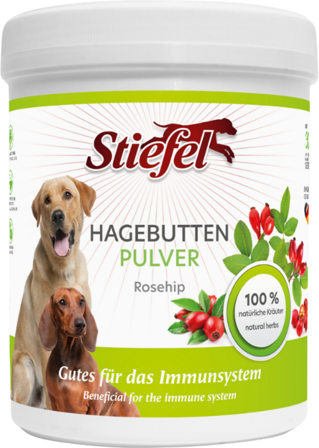 Šipkov prah Stiefel je fino mlet in služi kot dodatek h glavni krmi vašega psa. Šipek lahko pomaga podpirati imunski sistem. Prah ne vsebuje sladkorja, umetnih arom ali barvil.