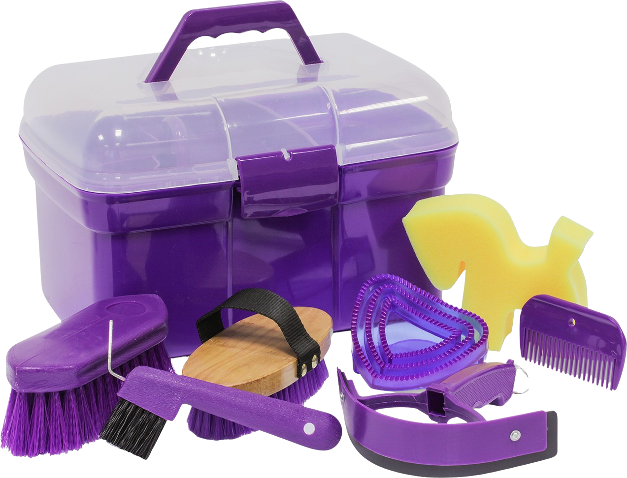 V notranjosti boste našli vsa bistvena orodja za nego: krtača odstrani grobo umazanijo, gumirana krtača pa doda končni sijaj. Poskrbljeno je tudi za grivo in kopita - z glavnikom za grivo in robustnim čistilcem kopit. Posebni dodatki, kot so krtača (curry comb) v obliki srca, mini strgalo za znoj in zabavna gobica v obliki konja, dopolnjujejo komplet in spreminjajo nego v užitek! S tem kompletom ste takoj pripravljeni na delo.