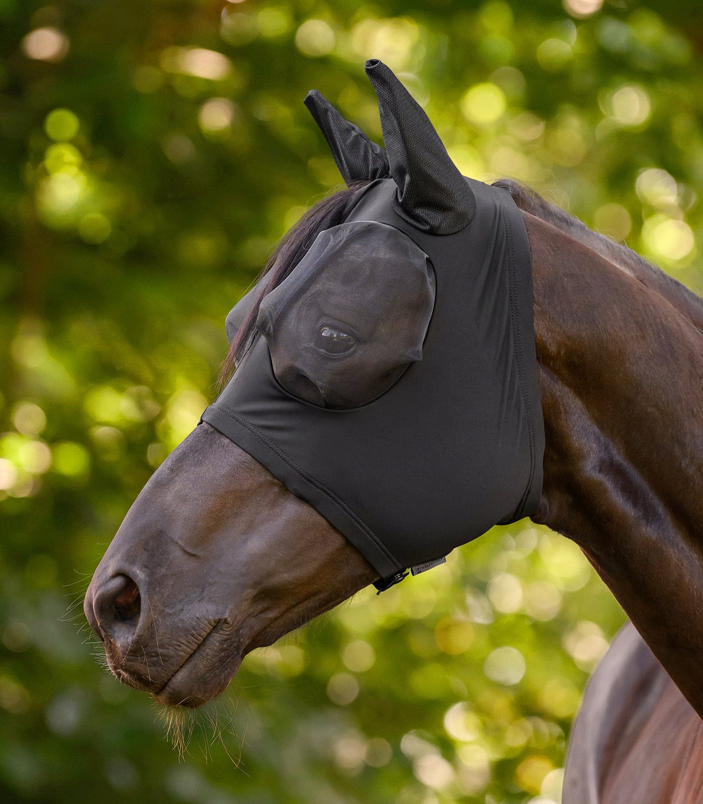 Da bi preprečili točke pritiska, so vsi robovi maske obrobljeni z mehkim flisom, ki se nežno prilagaja konturam konjeve glave. Vgrajeni ušesni vstavki iz mrežice, ki prepušča zrak, zagotavljajo dodatno varnost, ne da bi se pod masko nabirala toplota. Zaradi širokega zapenjanja z ježkom je masko zelo enostavno namestiti in individualno prilagoditi, tako da ostane varno na mestu, tudi ko se konj velikopremika ali valja. Nezahteven dodatek za vsak dan sezone žuželk.