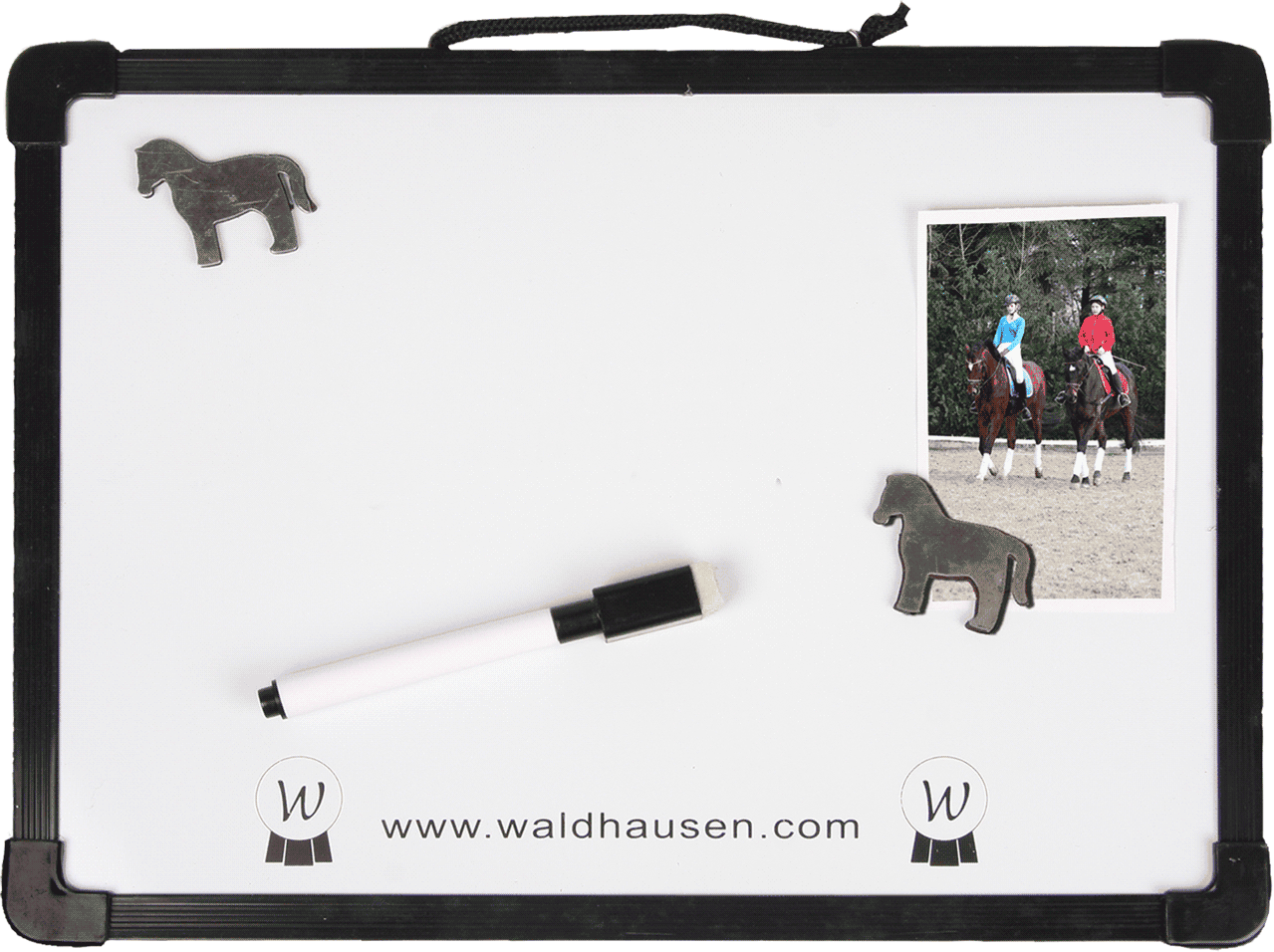 Posebnost: tabla služi tudi kot magnetna tabla! Dva ljubka magneta v obliki konjička zagotavljata, da bodo pomembne fotografije, urniki turnirjev ali računi varno na svojem mestu. Zahvaljujoč priloženi vrvici lahko tablo hitro in enostavno obesite.