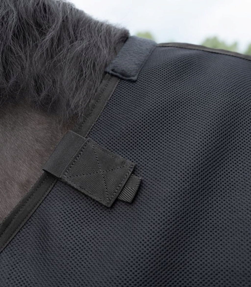 To spodnje pregrinjalo je izdelano iz zelo zračnega mrežastega materiala. Visokotehnološki material zagotavlja odlično prezračevanje in učinkovito preprečuje kopičenje toplote. Kljub lahkemu, nepodloženemu materialu (0 g) ohranja vašega konja toplega in optimalno podpira njegovo sposobnost odvajanja znoja po delu. Je idealna rešitev za dni z velikimi temperaturnimi nihanji, značilnimi za prehodne letne čase.