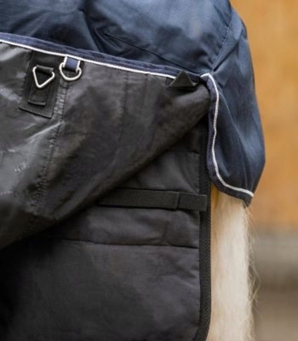 Posebnost je protizdrsni učinek. Silikonski potisk na hrbtni strani spodnjega pregrinjala zagotavlja, da zunanje pregrinjalo ostane na mestu in ne drsi - odlična pomoč pri vaši vsakodnevni rutini v hlevu. Zahvaljujoč elastičnim trakovom z ježkom ga je mogoče enostavno in varno pritrditi na zunanjo pregrinjalo na ramenih in zadaj. Preprosto zapiranje na prsih v obliki črke T z elastiko in ježkom dopolnjuje uporabniku prijazno zasnovo. Tako lahko svoj sistem pregrinjal v hipu prilagodite vremenu!