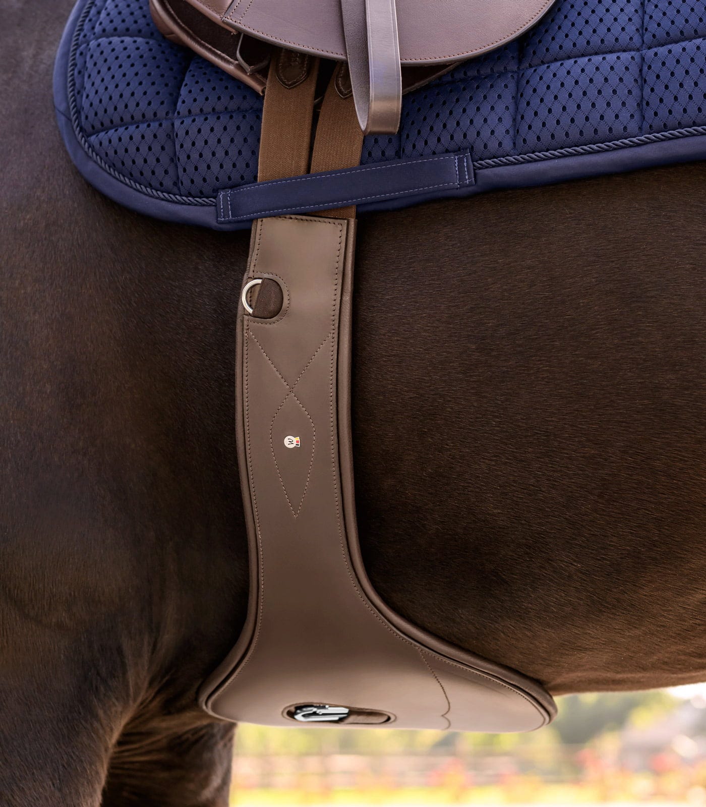 Za visoko udobje pri zategovanju je pas na obeh koncih opremljen z elastičnimi trakovi. Robustne valjčne zaponke iz nerjavečega jekla omogočajo preprosto in materialu prijazno zapenjanje. Za pritrditev pomožnih vajeti ali prsnih jermenov ima podsedelni pas visokokakovosten, na sredini nameščen karabin ter dodatne, ob straneh vgrajene D-obročke.