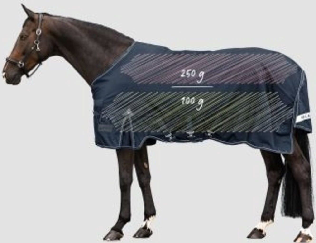 To pregrinjalo, izdelano iz robustne zunanje tkanine ripstop z gostoto 1200 denier, nudi odlično zaščito: je zanesljivo vodoodporno in zelo zračno, da preprečuje pregrevanje. Antibakterijska podloga zagotavlja higieno in je nežna do občutljive konjske kože. Penasti vložki na vihru zagotavljajo maksimalno udobje, saj nežno preprečujejo nastanek pritiskov, medtem ko velik všitek omogoča neomejeno gibanje.